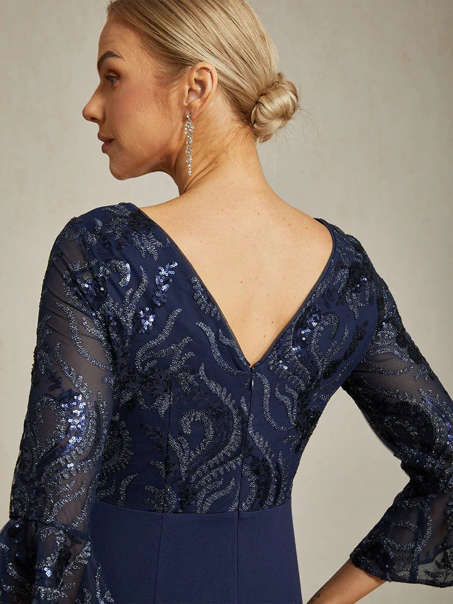 • Design: Boat neckline, fitted silhouette, asymmetrical draped detail, embroidered sequin lace overlay, flutter sleeves, knee length