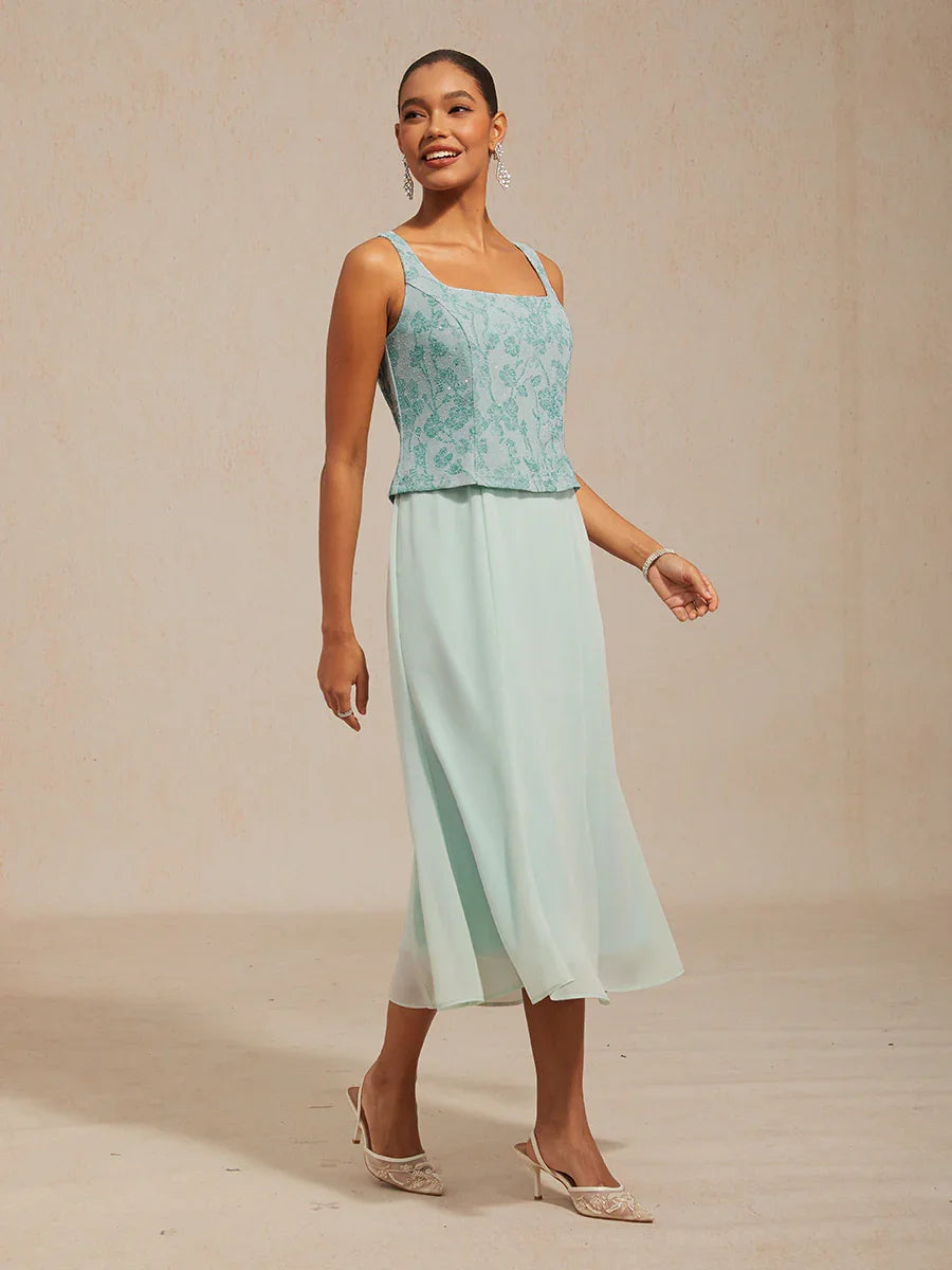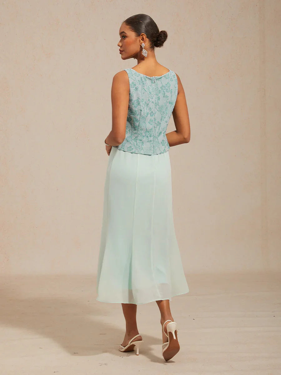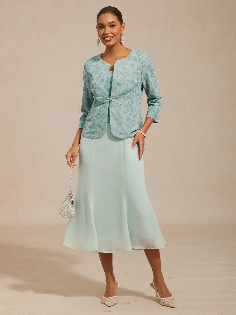 This knit floral embellished jacket dress is a sophisticated choice for any special occasion. The knit jacquard fabric with heat-set rhinestones on the jacket adds a touch of luxury and glamour. Fastened with diamond buttons, this jacket dress provides a flattering fit while remaining comfortable and stylish. The sleeveless dress features a matching upper half, while the lower portion is made from a soft, breathable knit fabric, offering comfort and flexibility. Perfect for spring weddings, parties, and cocktail events, this dress is designed with moms in mind, combining elegance with ease of wear.