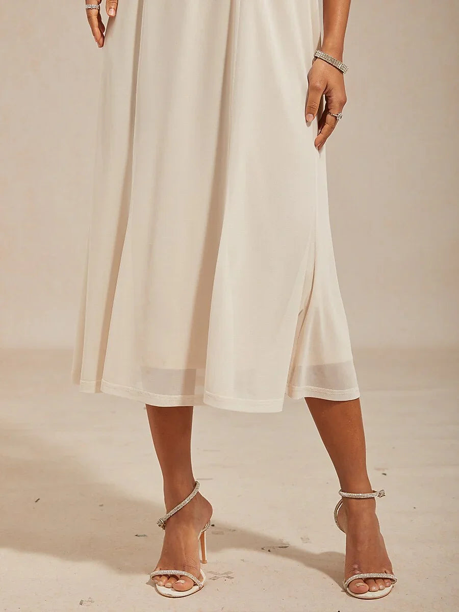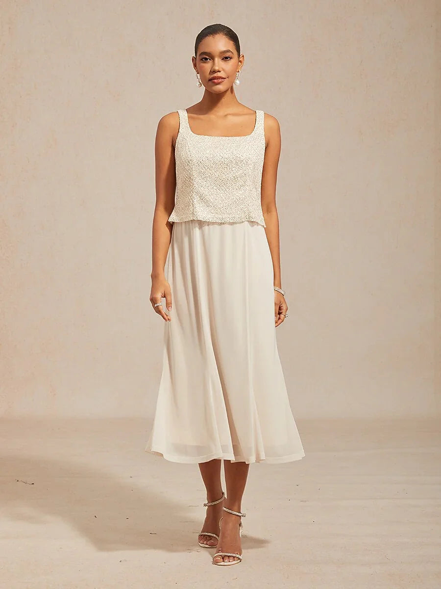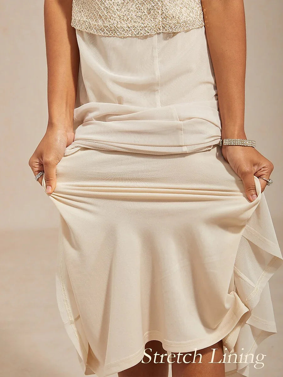 This chic jacket dress is the perfect choice for spring events. The mesh sequin 3/4 sleeve jacket adds a touch of glamour with subtle sparkle, fastened with diamond buttons for an elegant look. The sleeveless dress beneath features a soft knit lower half, providing comfort and stretch for a flattering fit. Ideal for weddings, parties, and cocktail gatherings, this piece is both stylish and comfortable, making it a go-to outfit for moms.