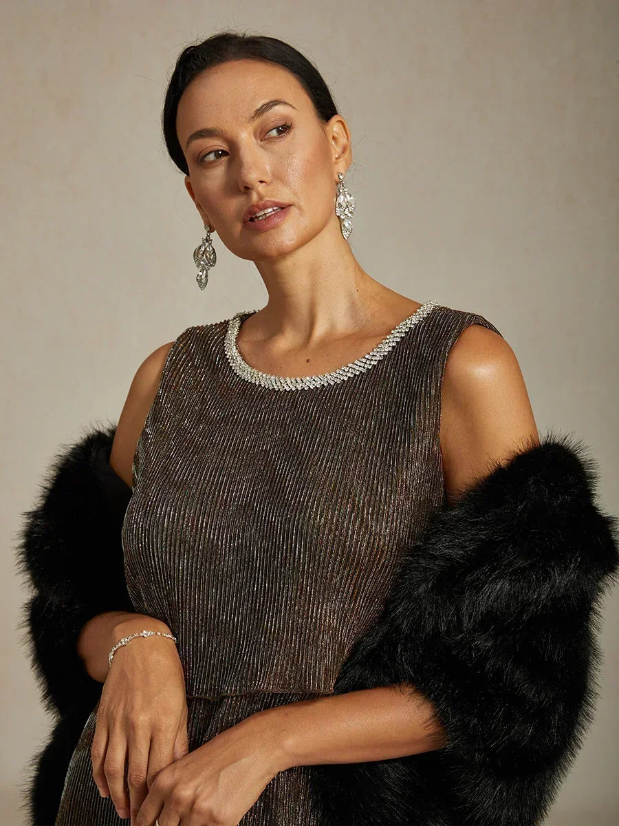 This elegant metallic pleated chiffon midi dress features a beaded round neckline and layered design, adding dimension and sophistication. The stretch lining ensures comfort while maintaining a flattering silhouette. Perfect for evening events, parties, or formal occasions. Can be paired with the matching cardigan for a complete look.